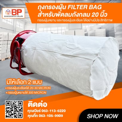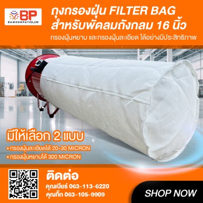 ถุงกรองฝุ่นสำหรับพัดลมถังกลม กรองฝุ่นอุตสาหกรรม กรองฝุ่นงานก่อสร้าง ฝุ่นควัน ฝุ่นสารเคมี ฝุ่นงานเชื่อม ฝุ่นขี้เถ่า ผงคาร์บอน ฝุ่นที่เกิดจากห้องพ่นสีในโรงงาน และอื่นๆ ผลิตจากผ้าโพลีเอสเตอร์ ที่สามารถป้องกันฝุ่นผงที่มีอนุภาคขนาดเล็กได้อย่างมีประสิทธิภาพ ความละเอียดในการกรองฝุ่น มี 2 แบบ กรองฝุ่นละเอียด 20-30 ไมครอน และกรองฝุ่นหยาบ 300 ไมครอน